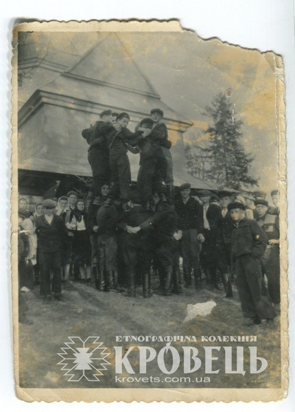 Світлина "Гурт людей. Забави біля церкви" (KYD1619), Гуцульщина, Івано-Франківська обл., Техніка: фотодрук, Матеріали: картон, фотопапір, Автор: Невідомий, середина ХХст., власник експонату: Етнографічна колекція "Кровець", власник прав на фоторепродукції: Етнографічна колекція "Кровець"