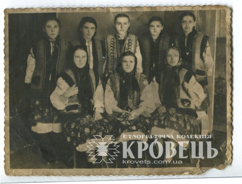 Світлина "Гурт жінок і дівчат" (KYD1657), Гуцульщина, Івано-Франківська обл., Техніка: фотодрук, Матеріали: картон, фотопапір, Автор: Невідомий, перша половина ХХст., власник експонату: Етнографічна колекція "Кровець", власник прав на фоторепродукції: Етнографічна колекція "Кровець"