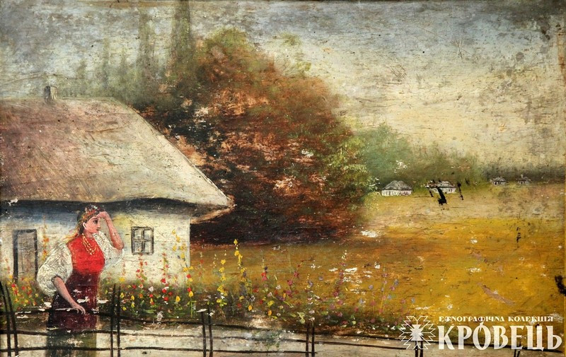 Народна картина "Дівчина виглядає" (KYD1873), Полтавщина, Полтавська обл., Миргородський рн., Техніка: живопис, Матеріали: олійні фарби, фанера, Автор: Невідомий, середина ХХст., власник експонату: Етнографічна колекція "Кровець", власник прав на фоторепродукції: Етнографічна колекція "Кровець"