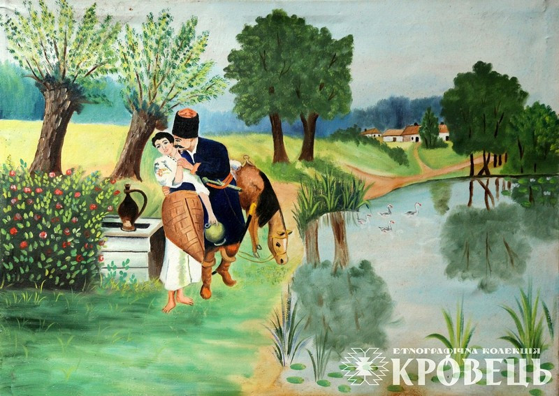 Народна картина "Козак з дівчиною коло криниці" (KYD1897), Середнє Подніпров'я, Техніка: живопис, Матеріали: олійні фарби, фанера, Автор: Невідомий, середина ХХст., власник експонату: Етнографічна колекція "Кровець", власник прав на фоторепродукції: Етнографічна колекція "Кровець"
