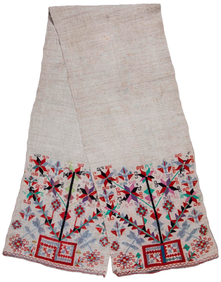 Рушник вишитий (KYD2174), Східне Поділля, Вінницька обл., Техніка: шиття, Матеріали: домоткане полотно, нитки бавовняні, нитки вовняні, Автор: Невідомий, перша половина ХХст., власник експонату: Етнографічна колекція "Кровець", власник прав на фоторепродукції: Етнографічна колекція "Кровець"