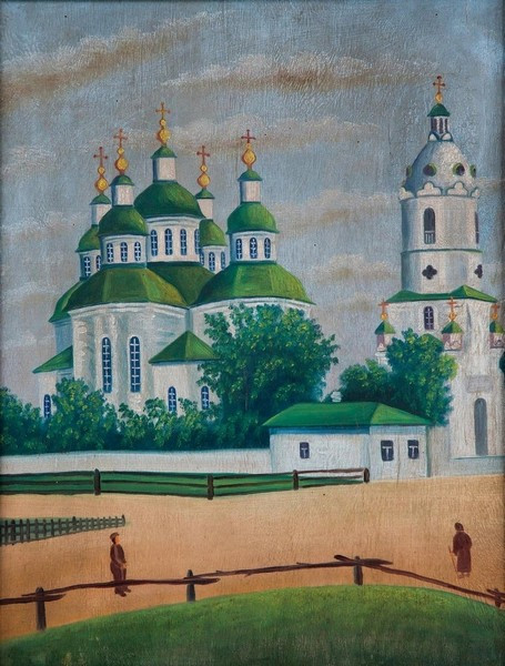 Народна картина "Краєвид села" (KSU16), Полтавщина, Полтавська обл., Гадяцький рн., с. Лютенька, Техніка: живопис, Матеріали: олійні фарби, фанера, Автор: Невідомий, перша половина ХХст., власник експонату: Колекція "Сулиця", власник прав на фоторепродукції: Колекція "Сулиця"